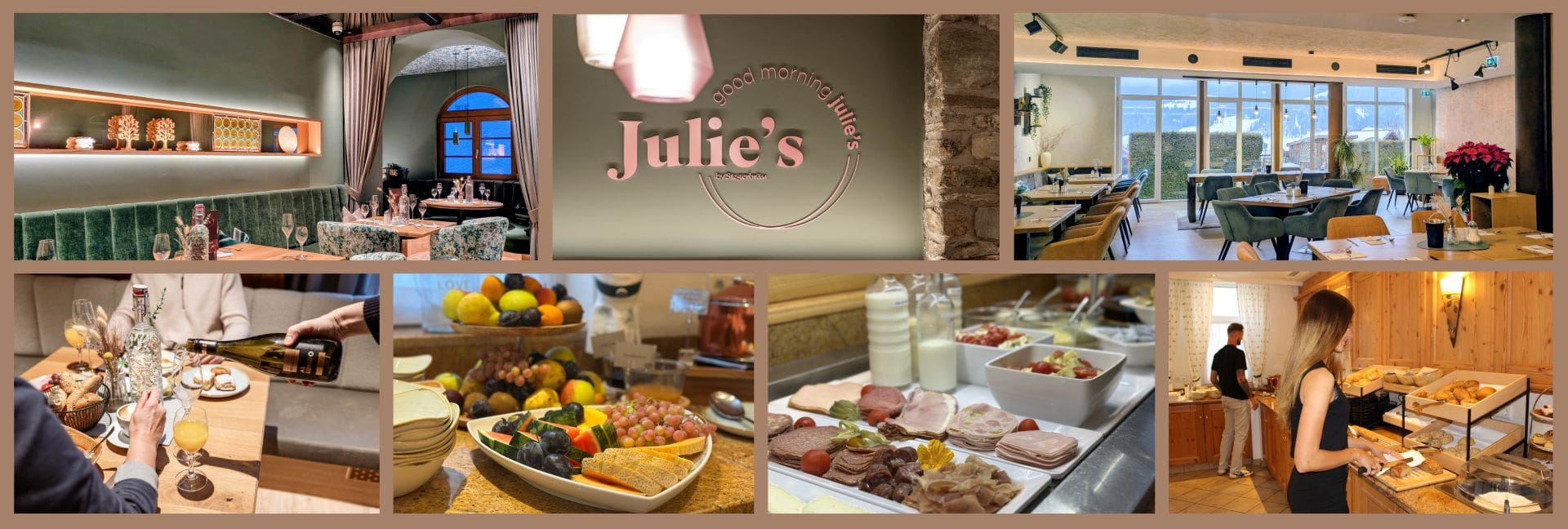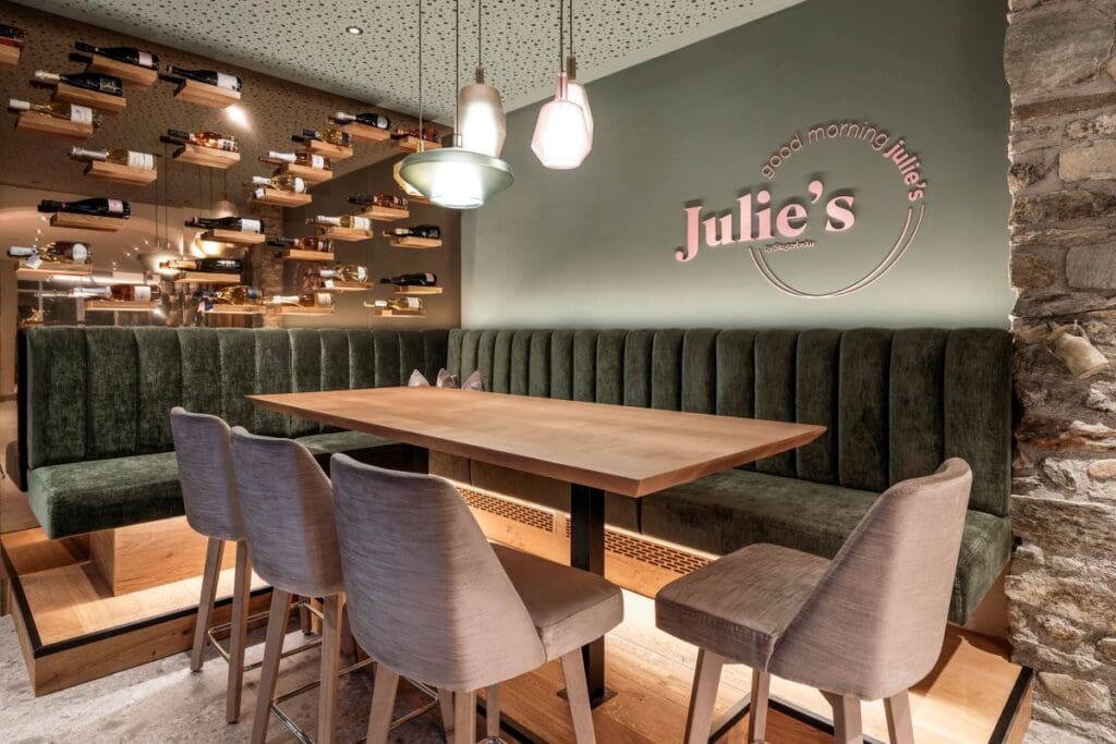 Seit dem Umbau im Herbst 2025, präsentiert sich die ehemalige Weinstube als Julie’s Wohnzimmer für eine neue Frühstückserfahrung: ein Bereich mit Wohnzimmer-Charakter, der nicht nur zum Frühstücken einlädt. Julie’s Wohnzimmer eignet sich auch perfekt als Café-Treff für alle, die einfach eine Tasse Kaffee oder ein Getränk in gemütlichem Ambiente genießen möchten. Täglich bis 12:00 Uhr begrüßen wir Sie gerne auch ohne Frühstücksreservierung – zum Plaudern, Treffen oder kurzem Innehalten.